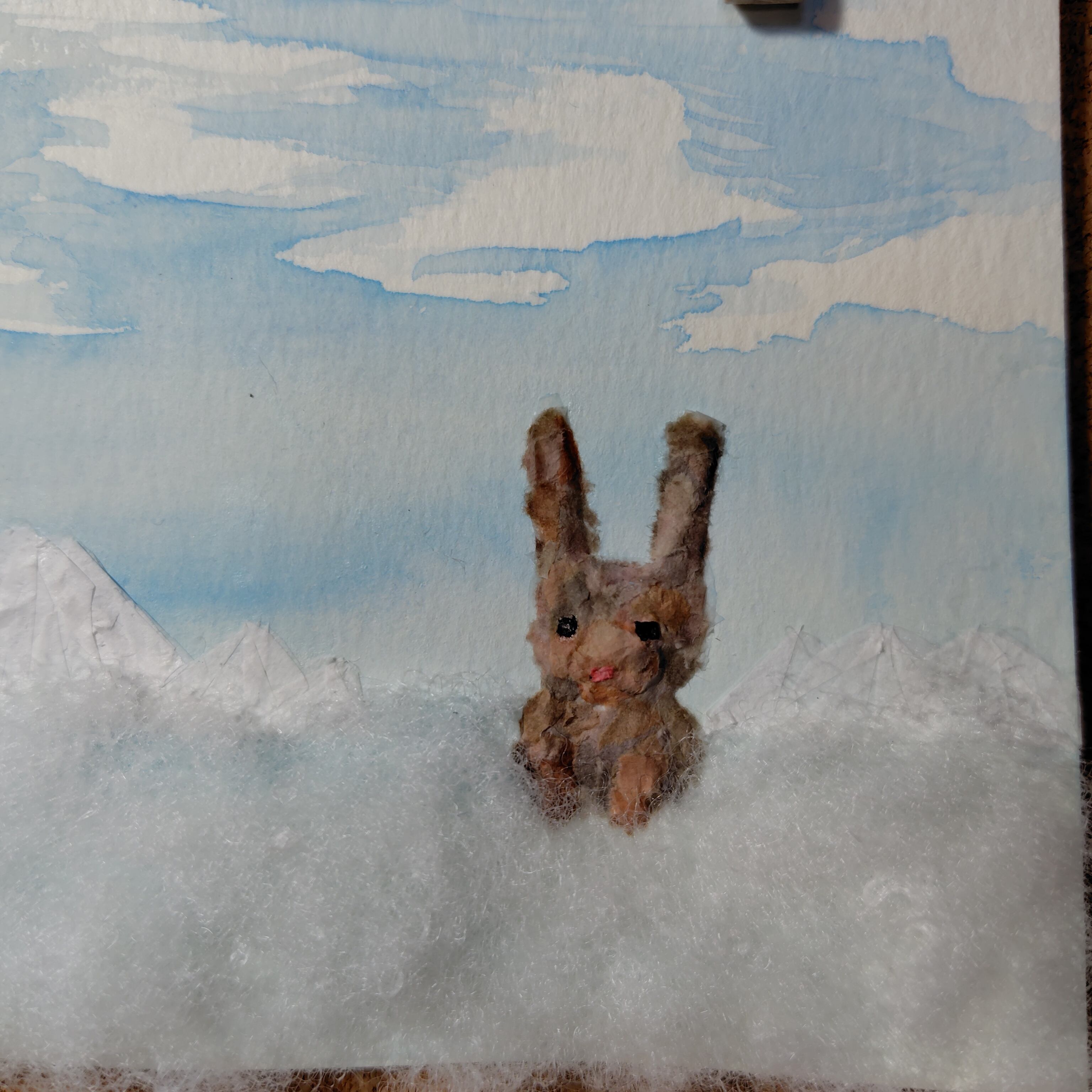 雪は綿で表現、野ウサギさんは和紙を重ねてぷっくりと。